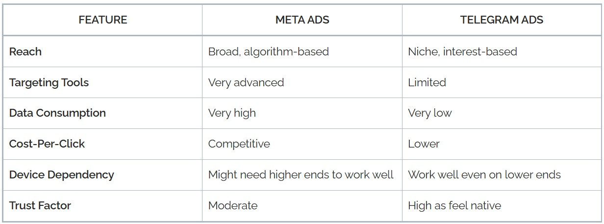 Verdict : The differences between the two are very obvious here as both on different approach. Meta Ads win on sophisticated targeting and analytics while Telegram win at direct, cost-effective outreach.